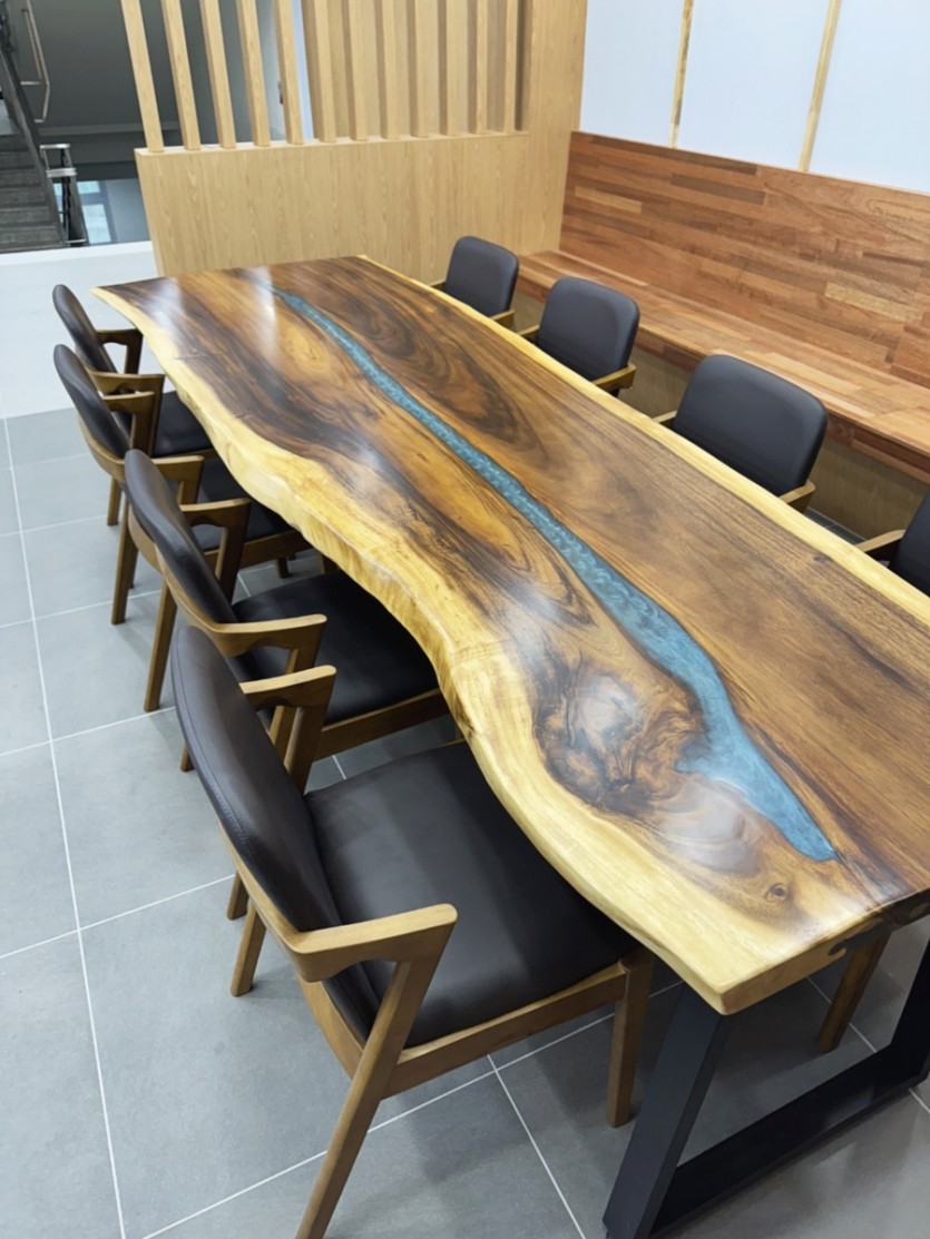 학교로 납품된 켈로브라 레진테이블입니다. 레진을 채워 넣어 자연스럽게 생긴 원목 틈과